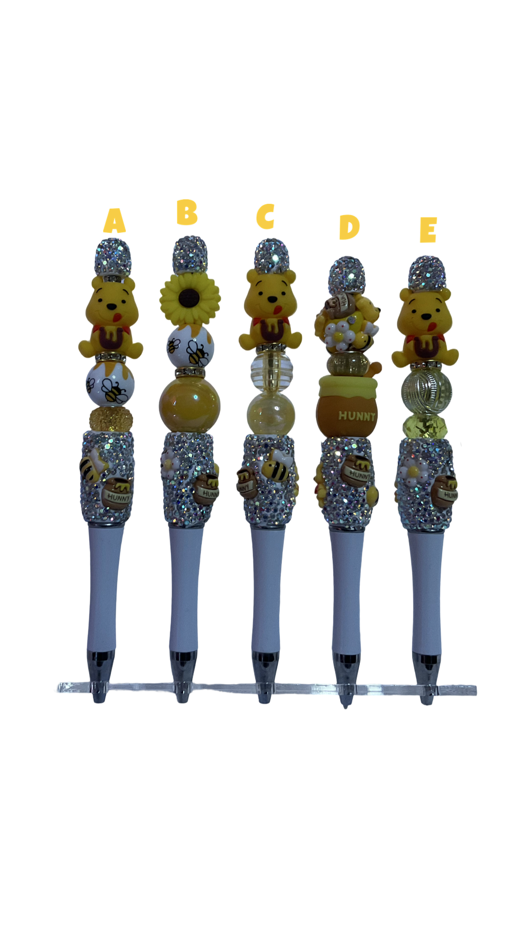 Bring a touch of the Hundred Acre Wood to your writing with these delightful Winnie the Pooh pens! Featuring everyone's favorite honey-loving bear, each pen sparkles with rhinestone embellishments that catch the light beautifully. Perfect for Disney fans and stationery collectors alike, these charming pens add a whimsical flair to your desk, journal, or gift collection. Whether you're jotting down sweet thoughts or signing important notes, let Pooh's gentle charm accompany every word you write.
