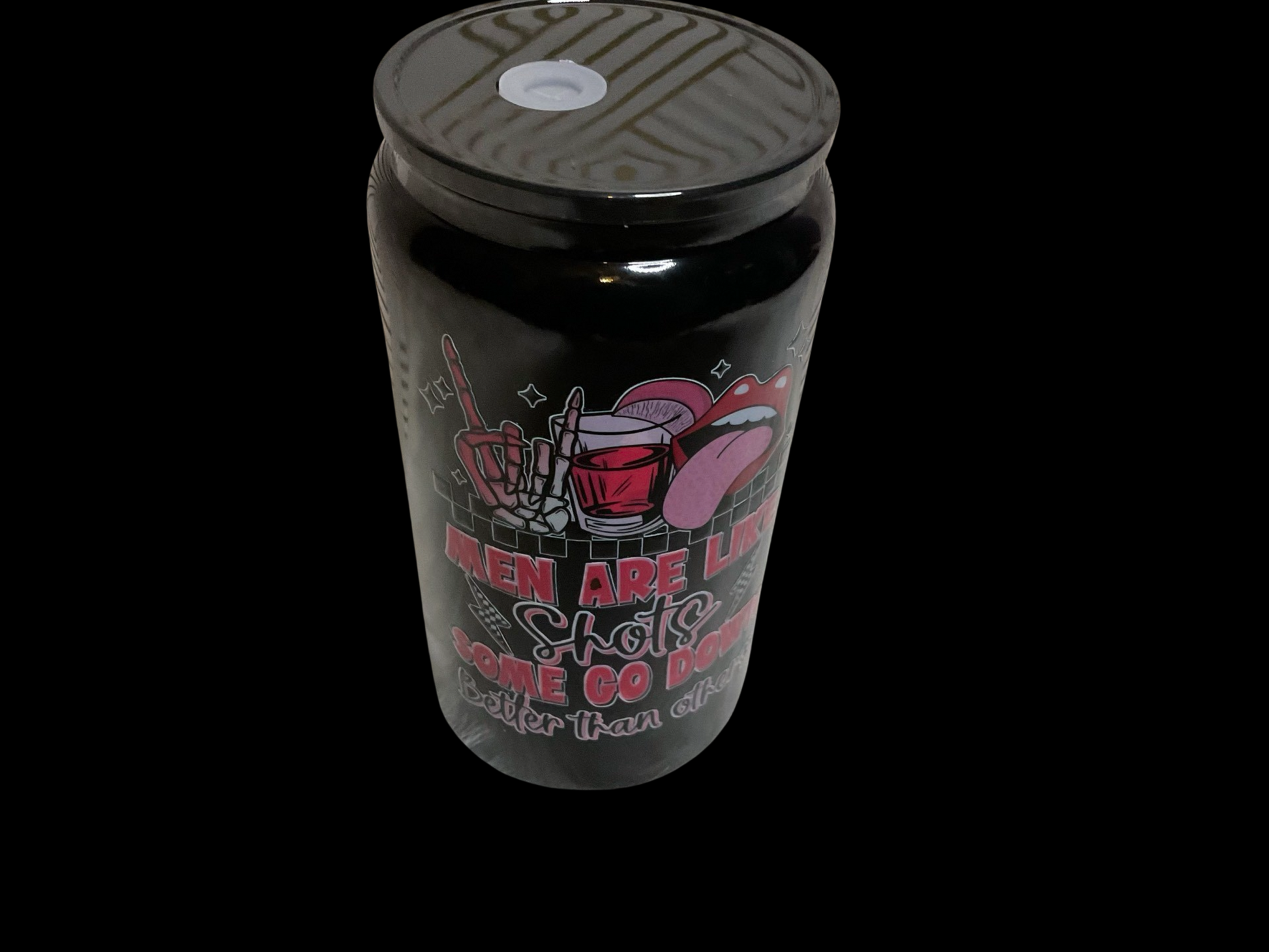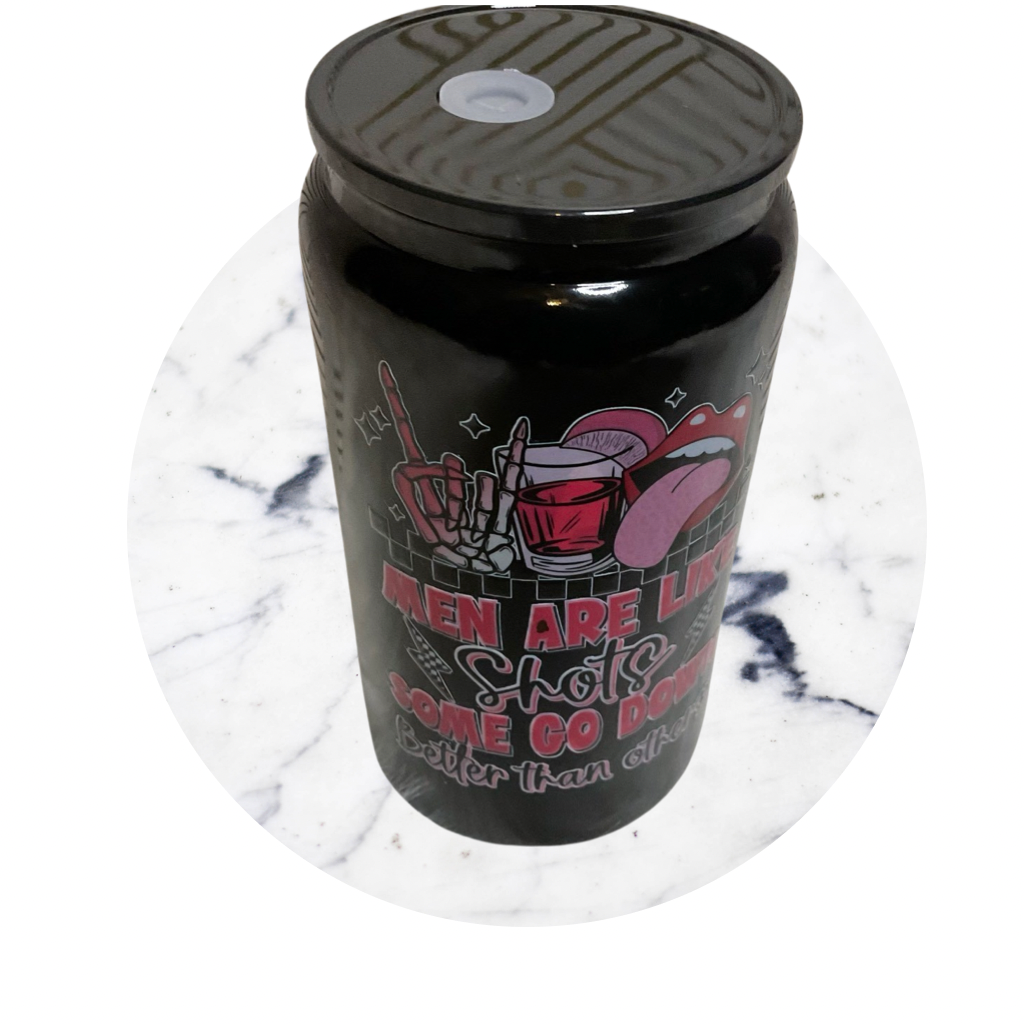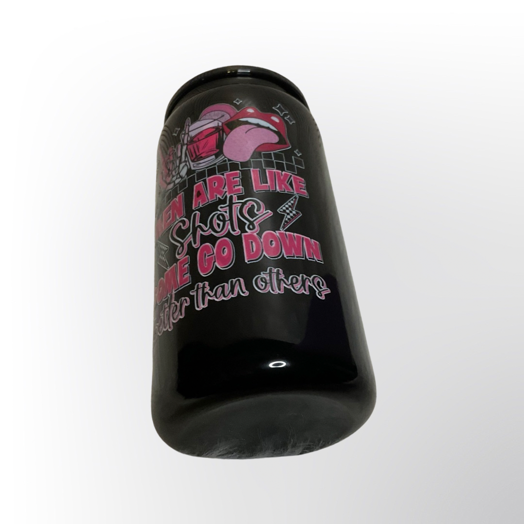 Quench your thirst and your sense of humor with our Men are like Shots 16 oz glass can tumbler. This playful tumbler is perfect for those who don't take themselves too seriously and enjoy a good pun. Plus, it holds just the right amount for a shot of your favorite drink. Cheers!